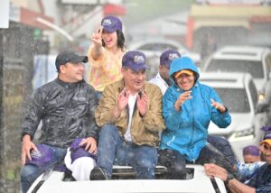Los simpatizantes, empapados de agua, mostraron su respaldo al candidato presidencial del partido morado, bajo la consigna “aunque caiga agua, de aquí no se mueve nadie”, mientras ondeaban sus banderas y levantaban la mano haciendo la seña del “vota 2”.