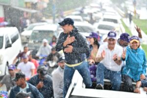 Martínez bajó de su vehículo y se unió a la gente del pueblo, abrazado bajo un torrencial aguacero, asegurando que “la lluvia es una bendición que viene a sellar la esperanza de un futuro seguro para nuestro país”.