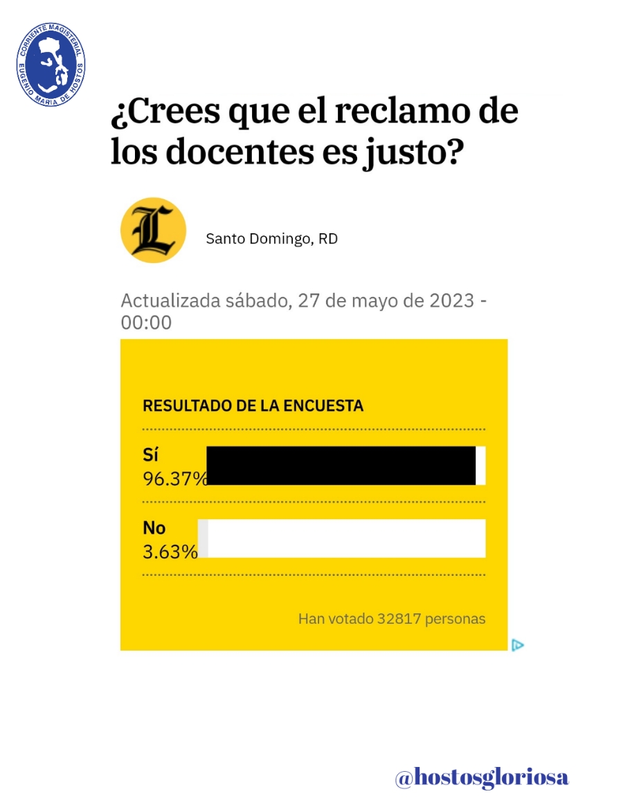 Santo Domingo, RD.- Un total de 32,817 personas votaron en un sondeo realizado por el periódico Listín Diario a través de las redes sociales. La encuesta llevada a cabo por uno de los principales periódicos del país, colgó en su página Web: https://listindiario.com/la-republica/20230527/crees-reclamo-docentes-justo_755610.html. La cual contenía la siguiente pregunta: