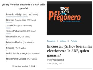 De acuerdo a los resultados arrojados por esta encuesta Hidalgo presidiría el ADP, llevando la delantera con un 55% , equivalente a 1.410 votos, frente a sus oponentes.