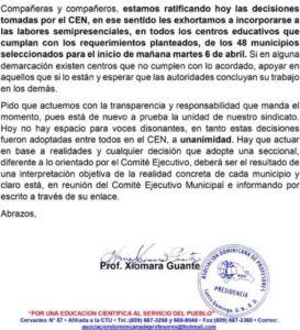 Eduardo Hidalgo afirma: «Se debe aclarar que lo que se acordó a unanimidad fue requerir el cumplimiento del protocolo y de eso, la ADP no tiene ninguna constancia ni se ha recibido un informe probatorio al respecto por parte de las autoridades. Las voces disonantes son las que convocan a volver a la Escuela, dejando la responsabilidad de esa decisión a los docentes de forma individual, sin que estos cuenten con ninguna constancia de cumplimiento de las condiciones del protocolo y se estableció, además , como condición indispensable que los docentes y personal administrativo, antes de reiniciar la docencia, tienen que recibir las dos dosis de la vacuna, y esta tampoco se ha cumplido. Eso si es disonante»