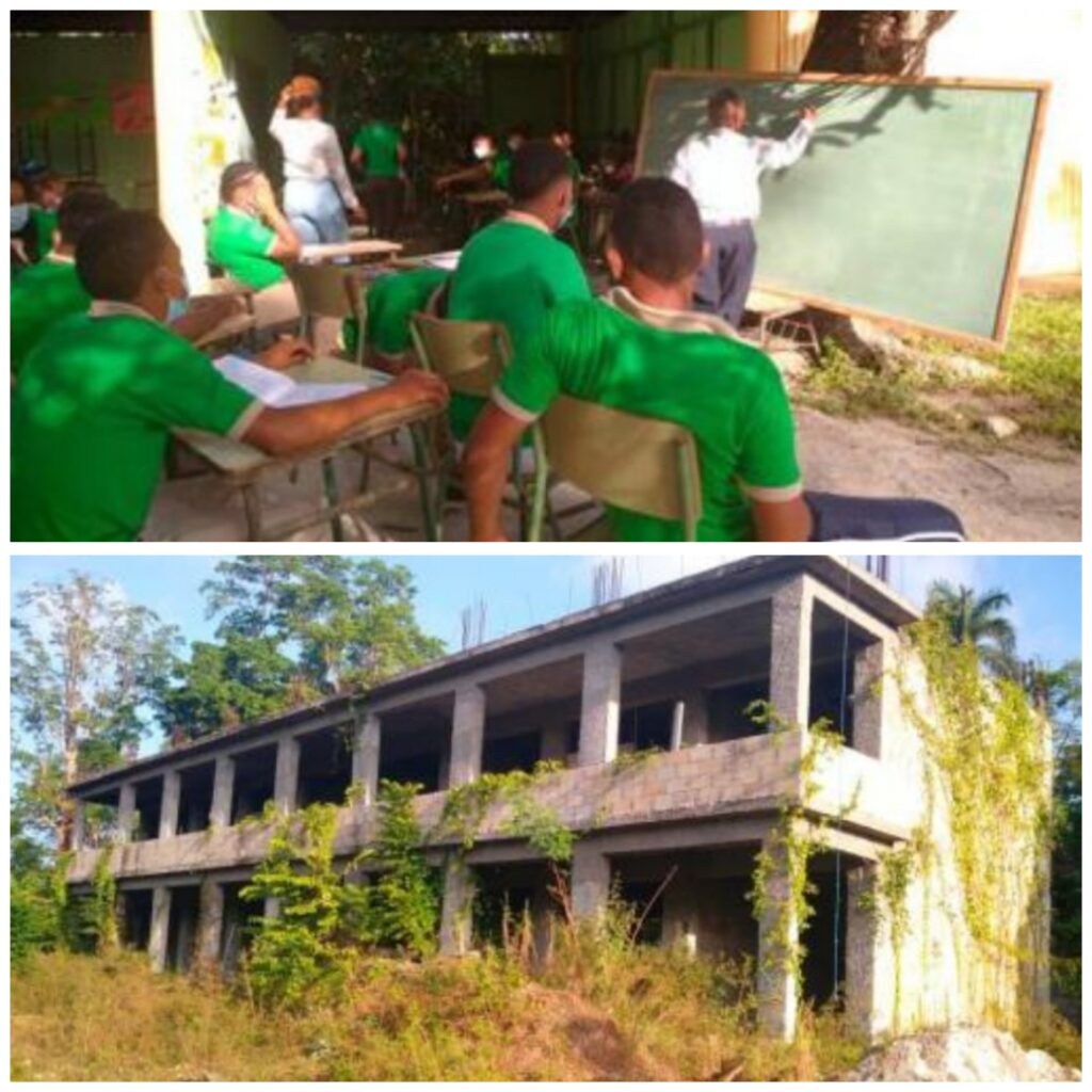 Decenas de estudiantes del liceo profesor Silverio Porquín Acosta, del distrito municipal de San Francisco Vicentillo, de la provincia de El Seibo, iniciaron el año escolar recibiendo docencia en una enramada y debajo de una mata de mango.