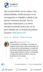 “Un periodista no persigue, no acosa, no organiza encerronas como entrevistas, no se burla de los entrevistados, no edita las entrevistas tendenciosamente, no busca rating desperrando el morbo, ni chantajea a nadie para obtener fortuna. (Eso me enseñaron en las aulas)”, dijo Juan TH.